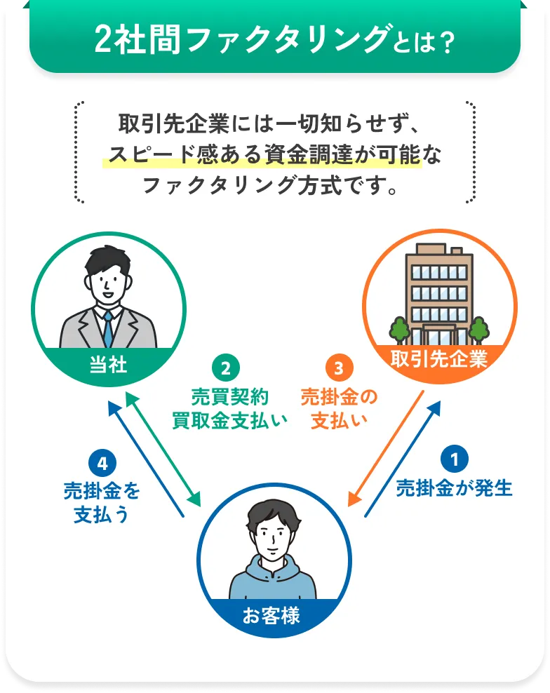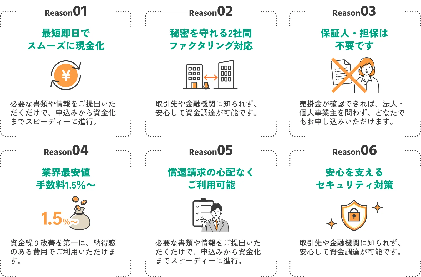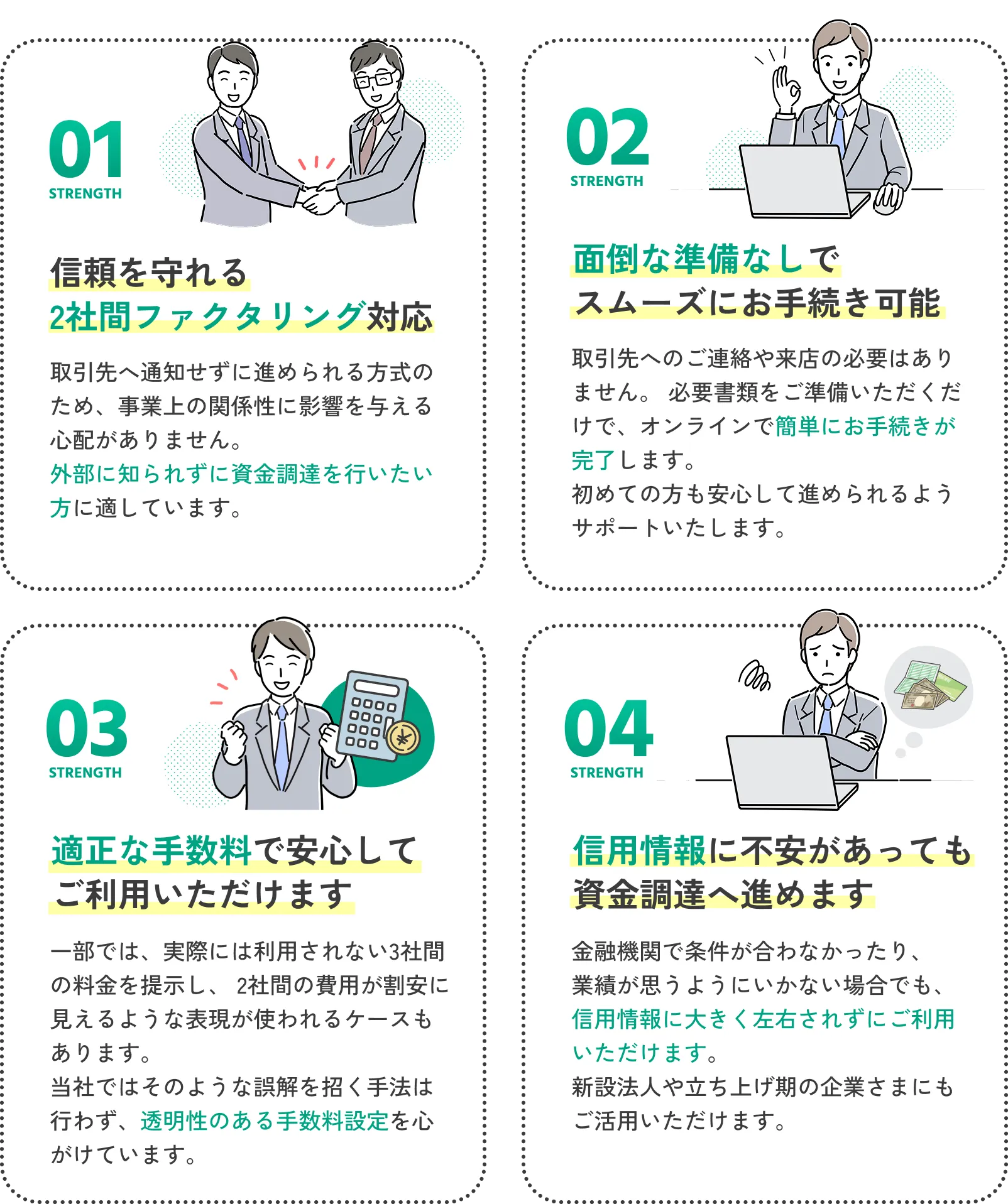 登記なしでのご利用も可能です。債権譲渡登記を行わない形のファクタリングにも対応しておりますので、必要に応じてお気軽にお申し付けください。