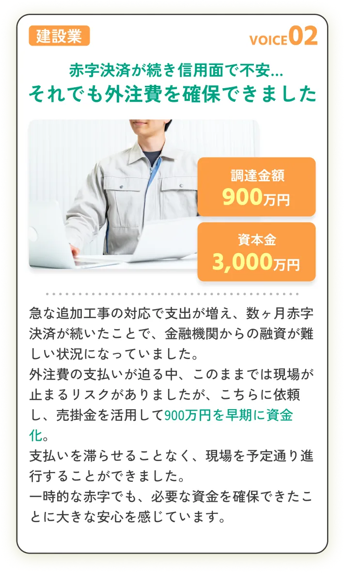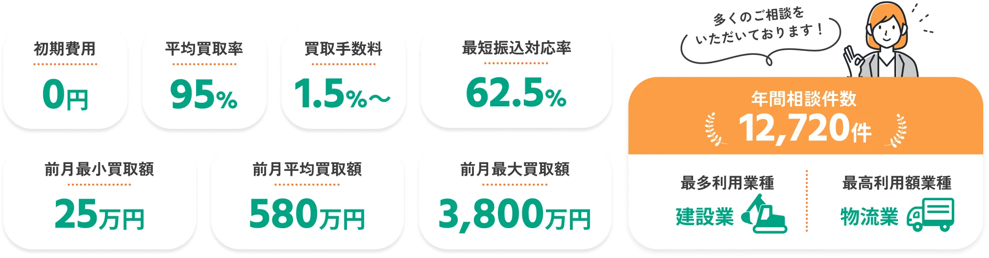 ご利用いただけるのは、売掛債権の請求額が30万円以上の場合となっております。条件を満たしていればお申し込みいただけますので、まずはお気軽にご相談ください。
