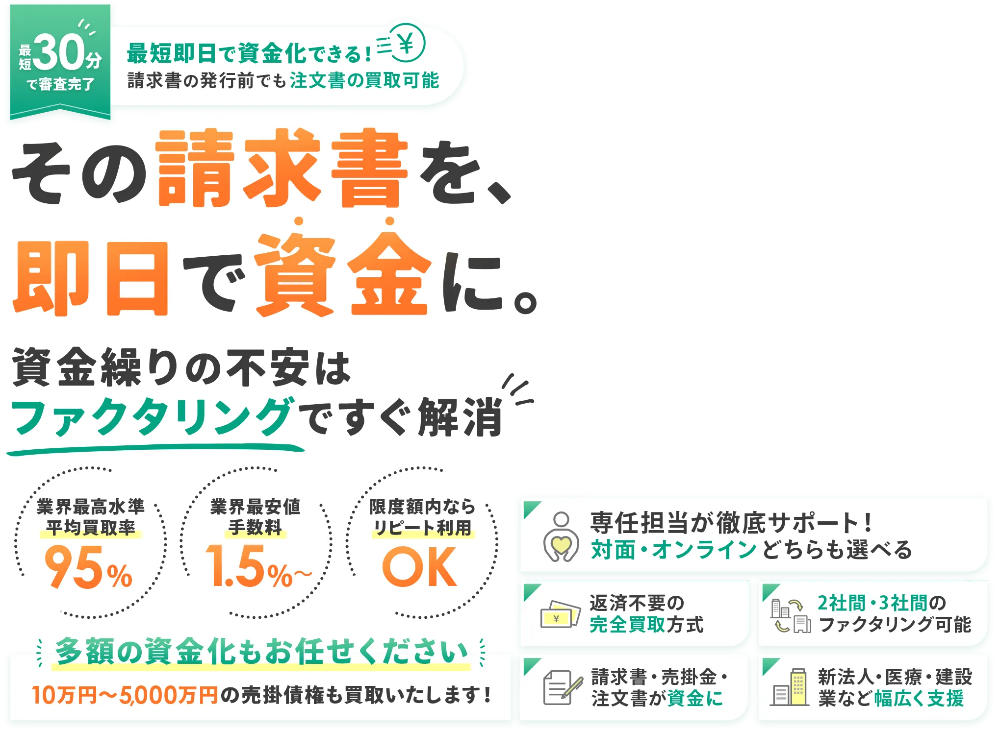 ご利用いただけるのは、売掛債権の請求額が30万円以上の場合となっております。条件を満たしていればお申し込みいただけますので、まずはお気軽にご相談ください。